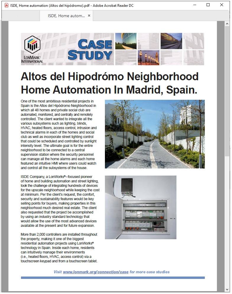 Descargue el caso de estudio donde se describe la automatización residencial de un complejo compuesto por 48 viviendas unifamiliares y zonas comunes (club social) con un alto nivel de automatización incluyendo funcionalidades de : control de accesos, control de iluminación, control de clima (aire acondicionado y suelo radiante), supervisión de alarmas técnicas, supervisión de alarmas anti-intrusión, control de persianas, interfaces locales y web…